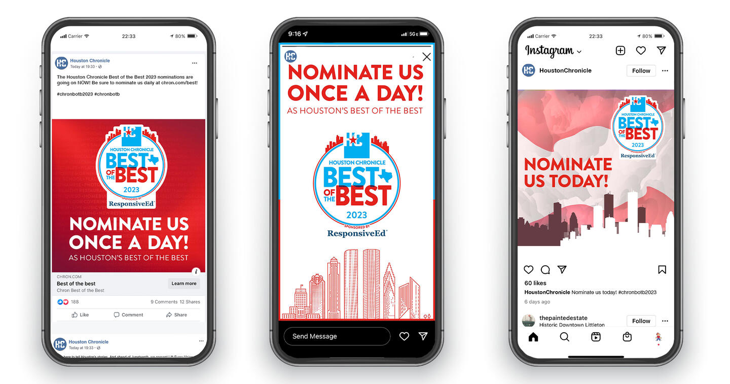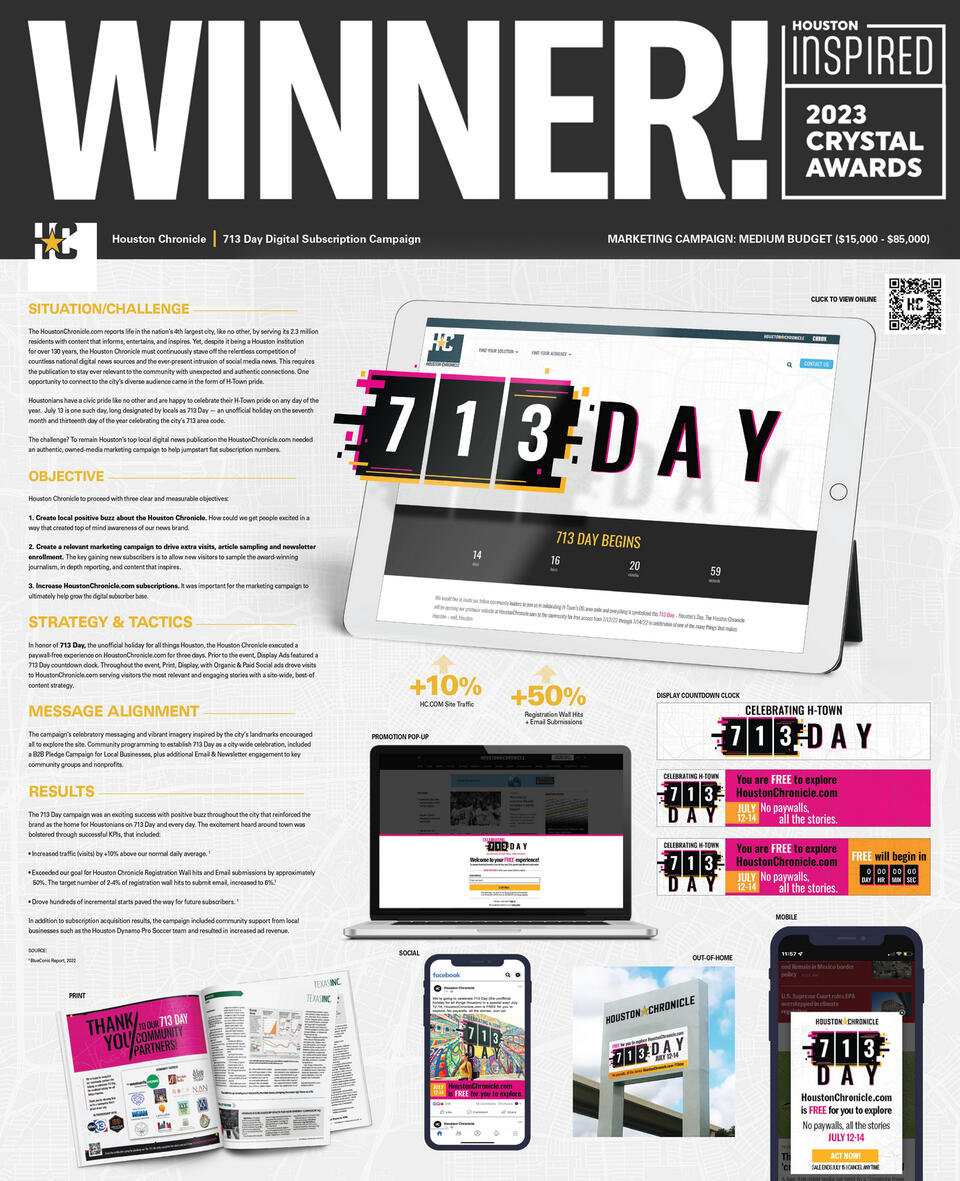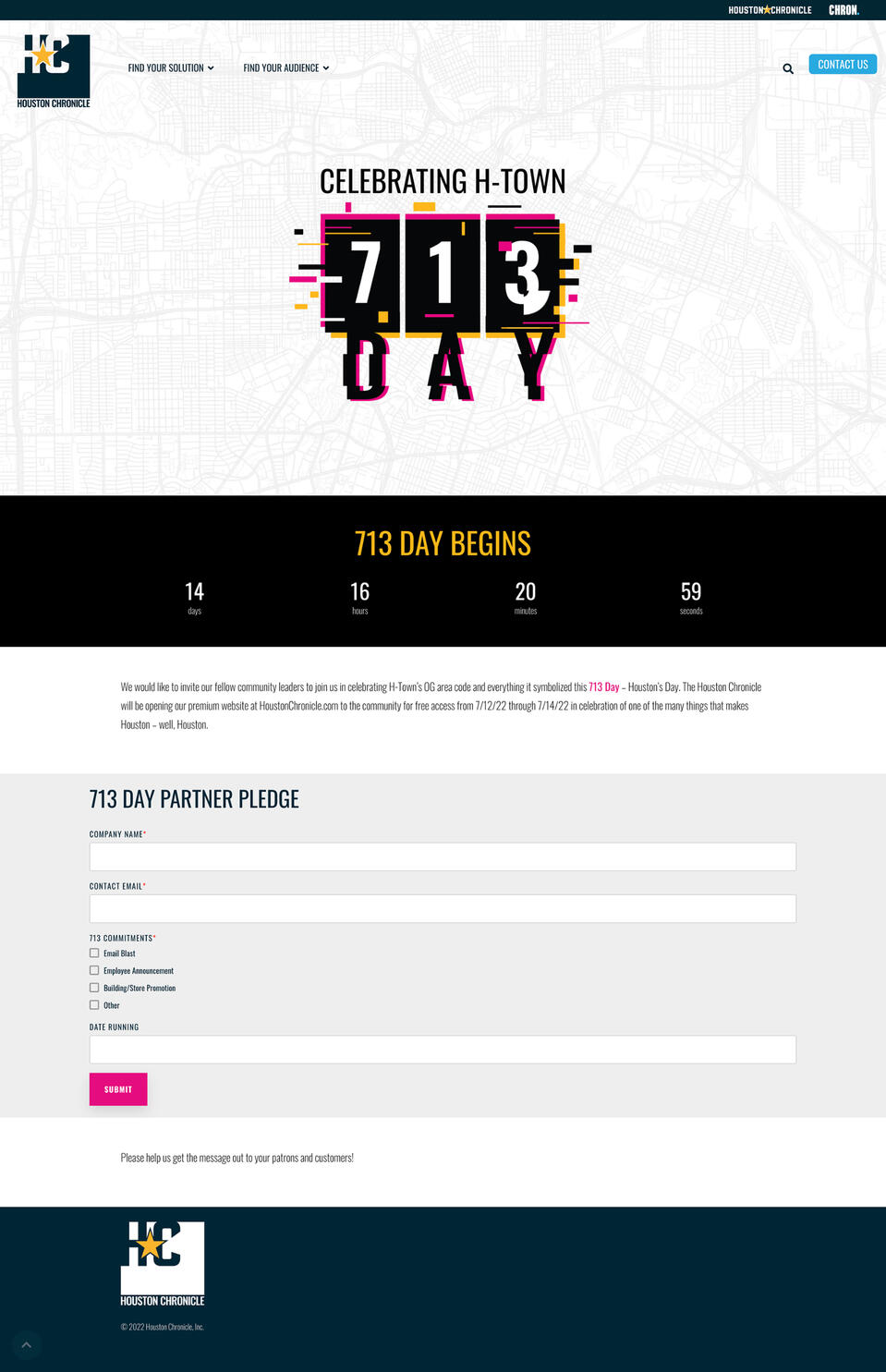 In 2022 the Houston Chronicle launched a subscription driven campaign rallied around Houston's OG area code; 713. Below are various parts of the campaign that I helped develop and mock out with my team. It includes sharable social posts, partner pledge forms and newsletter campaigns driving HC subscriptions plus more.