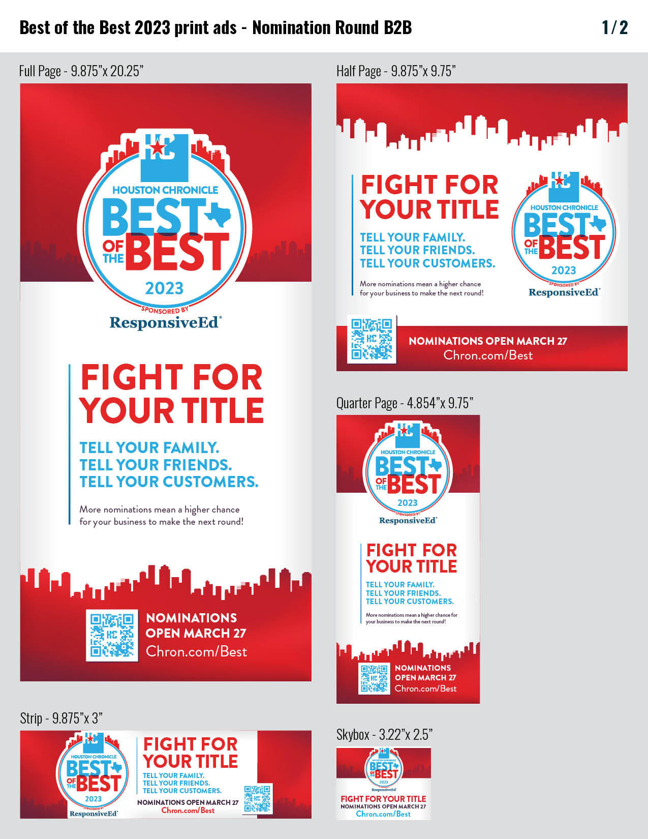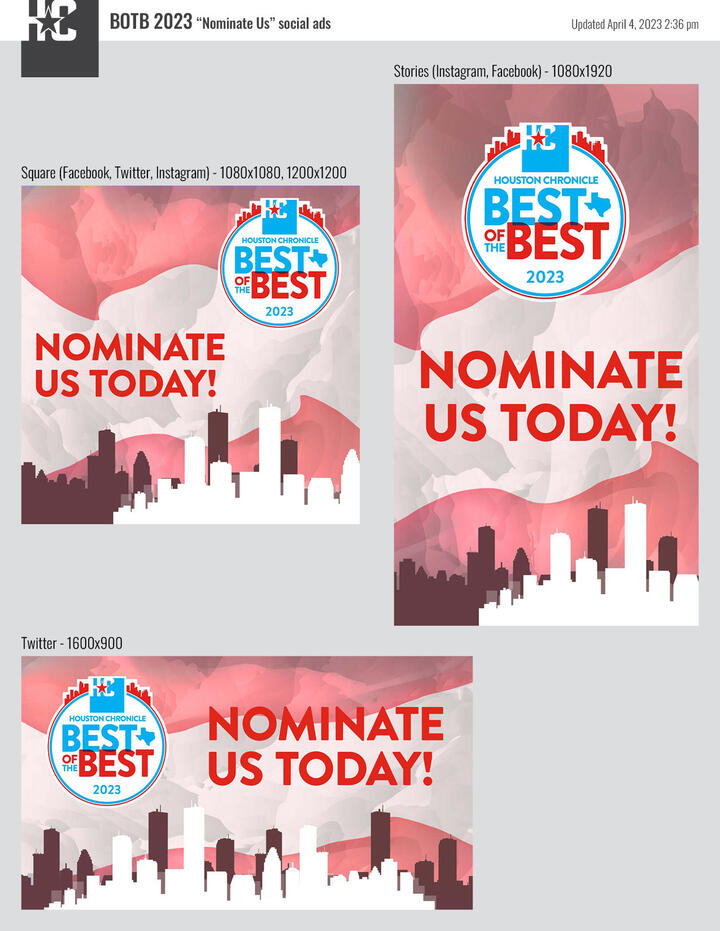 Best of the Best is a B2B event where Houstonians vote for their favorite business to find out who is the best business in Houston. With over 150 categories to vote in and bragging rights up for grabs, businesses from all over the Houston area fight for their title. 2023 was the 4th annual Best of the Best, with our largest turnout ever. There are many parts to this project from sales deck pitches to the final website design. Here are some core elements of this project, including the final winners site, that I've worked on as part of the team.