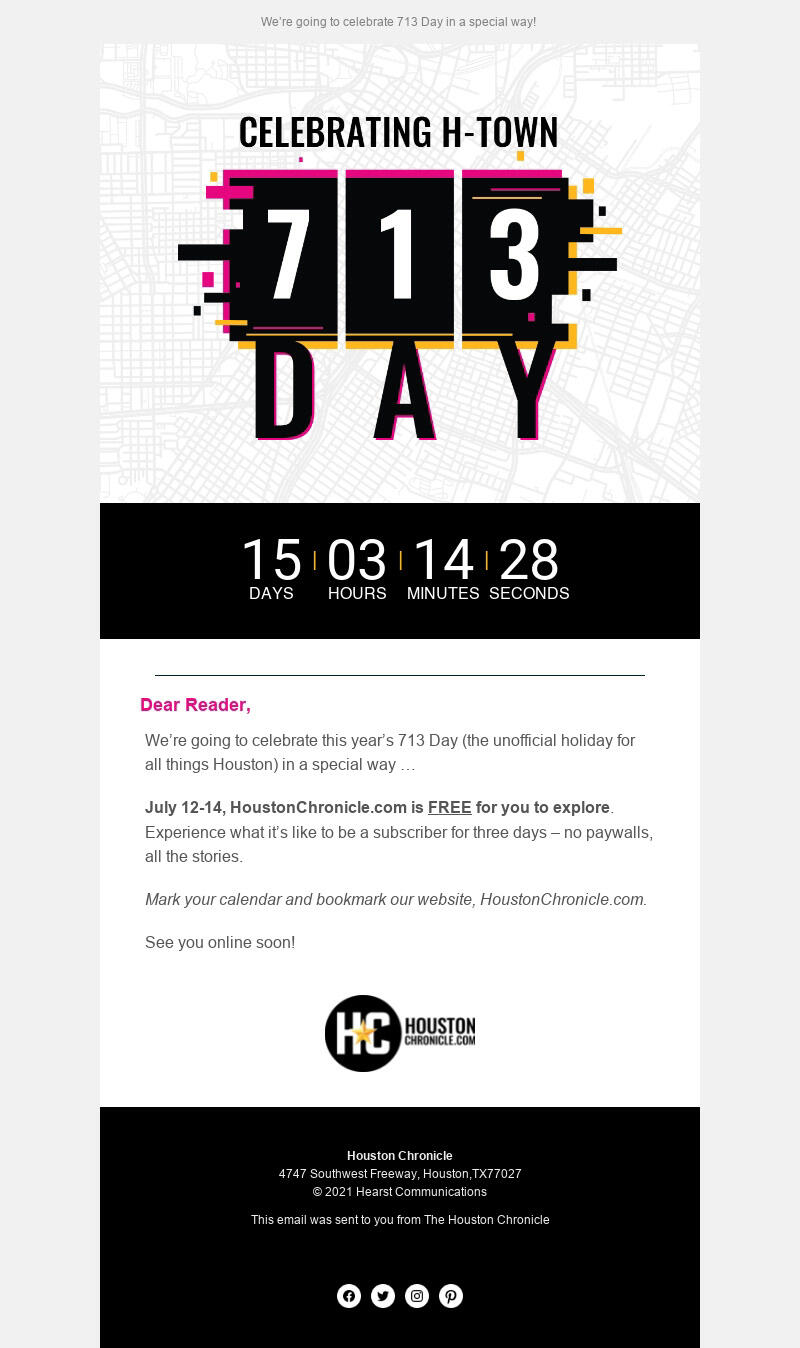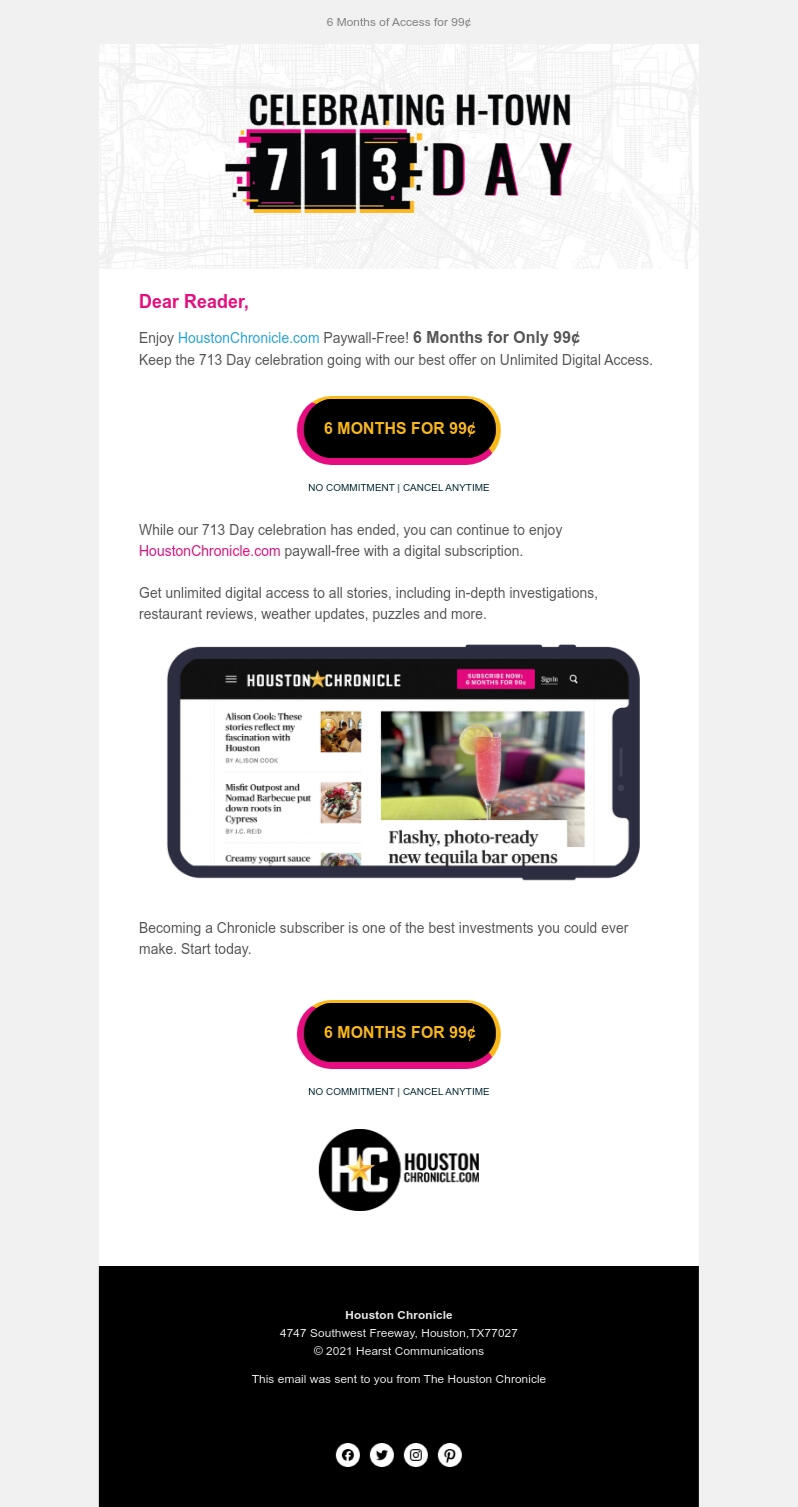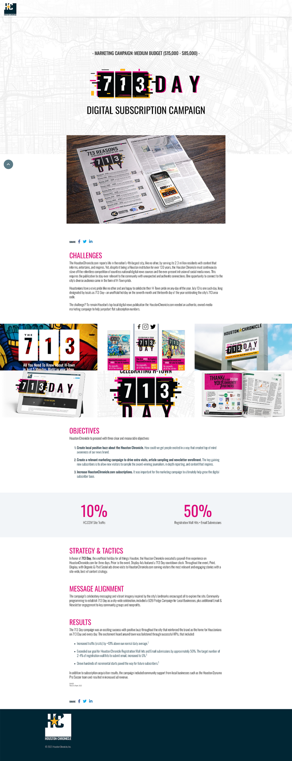 In 2022 the Houston Chronicle launched a subscription driven campaign rallied around Houston's OG area code; 713. Below are various parts of the campaign that I helped develop and mock out with my team. It includes sharable social posts, partner pledge forms and newsletter campaigns driving HC subscriptions plus more.
