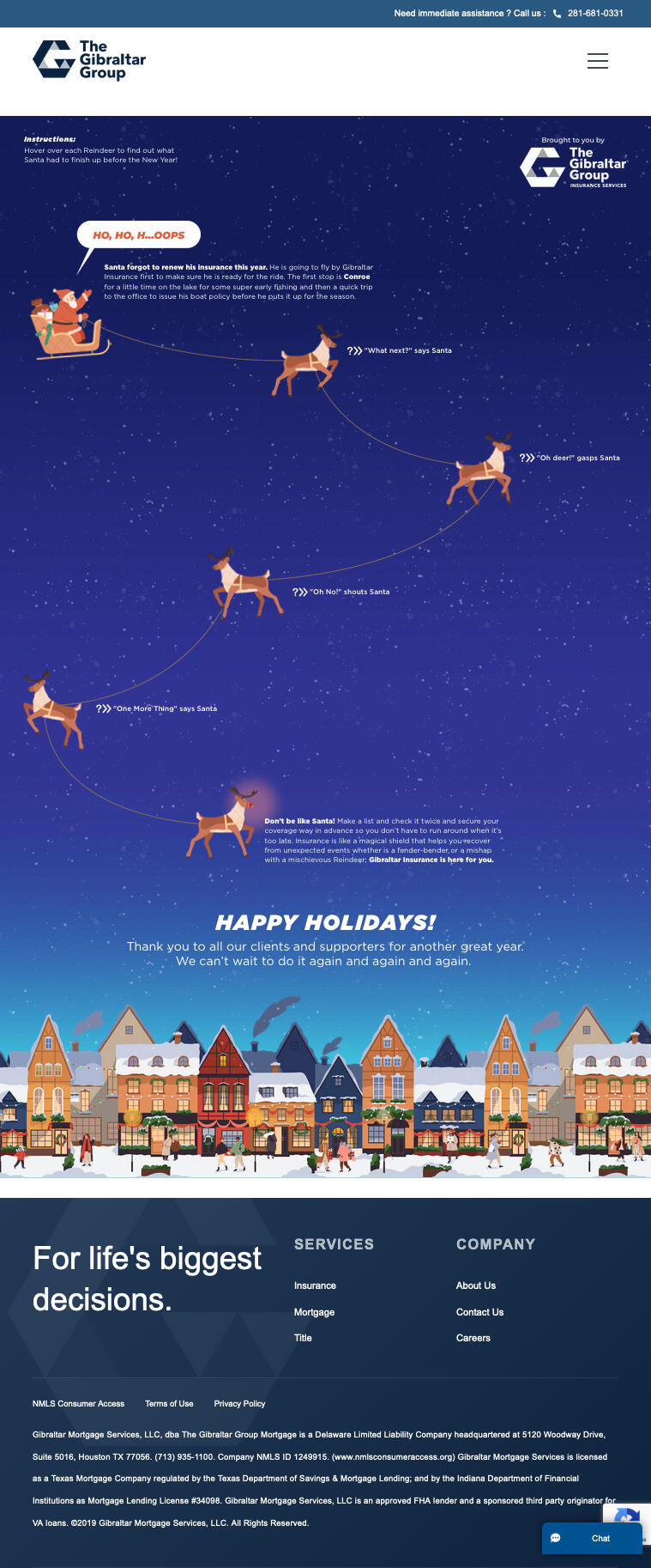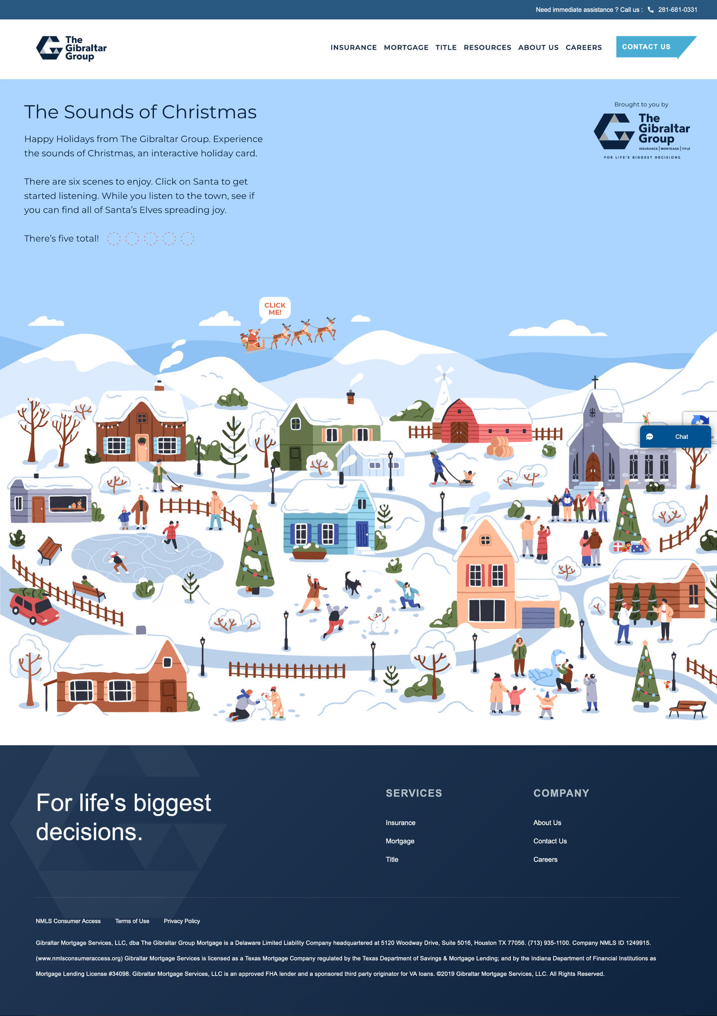 Below are Christmas B2C experience created for The Gibraltar Group Insurance Company. What started out as a fun way to engage insurance office reps with their customers during a pandemic year, has evolved into more elaborate holiday sites each year. Click on each image to view the projects in full. All sites are in archival mode and no longer published directly on the clients site.