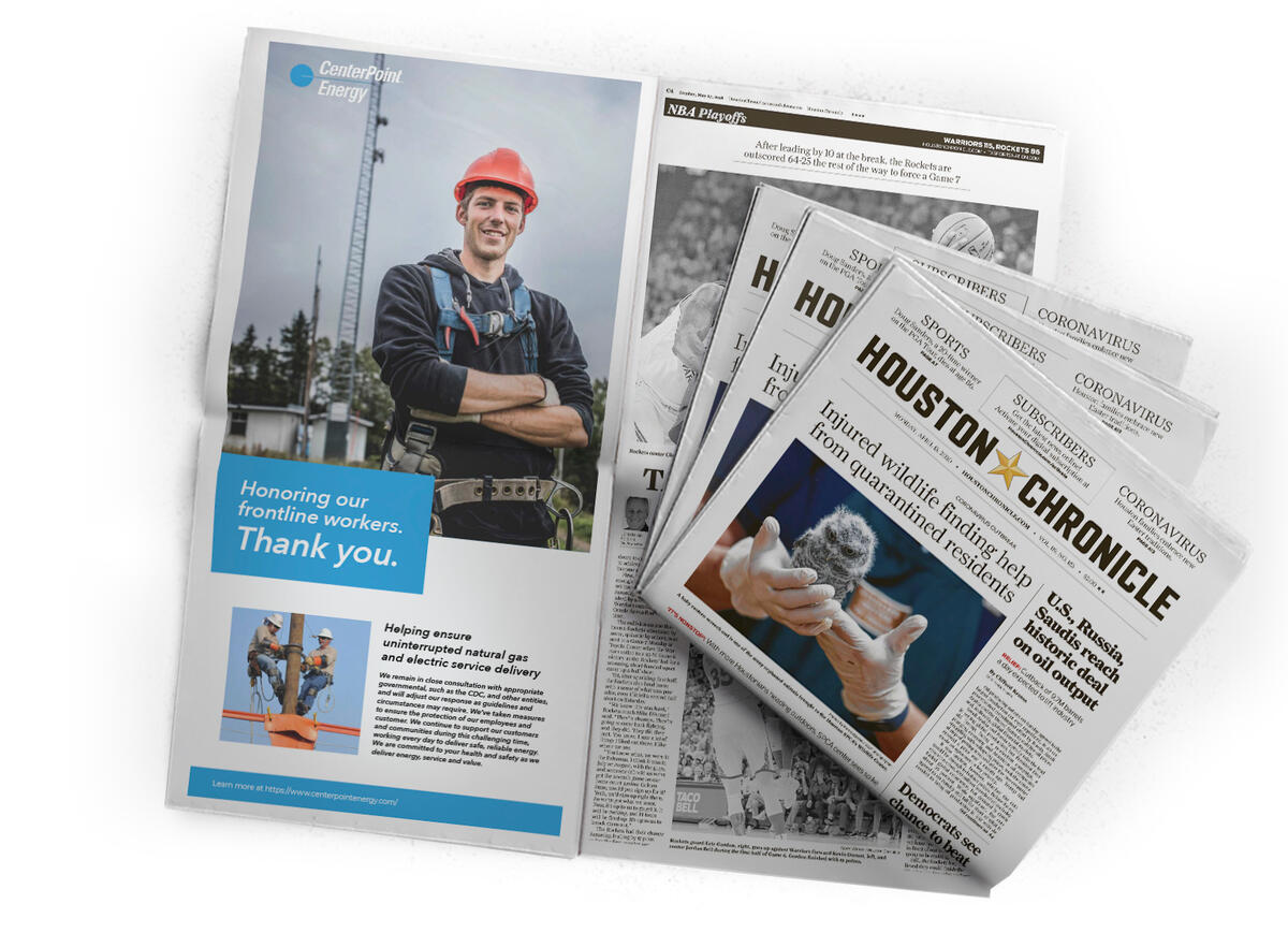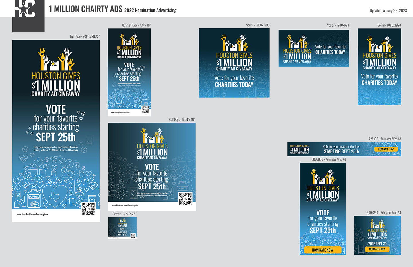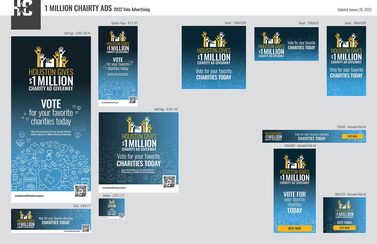 Houston Gives is a charity ad event in where Houstonians vote for their favorite charities. At the end of the competition the charities nominated in each categories received in-kind advertising print sections. Each year the Houston Chronicle gives out up to one million dollars in free advertising to charities.