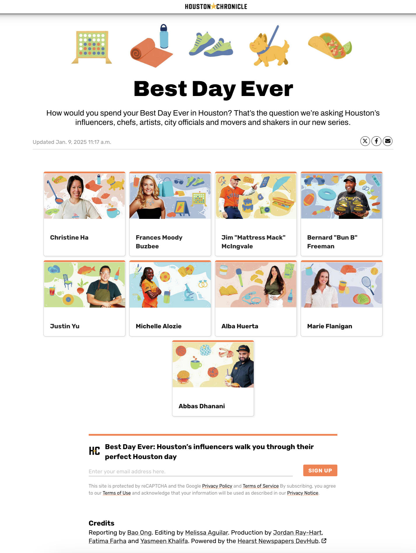 Best Day Ever is an Illustrative Editorial project launched in August of 2024. All assets are hand illustrated by myself and I continue to manage this brands identity."How would you spend your Best Day Ever in Houston? That’s the question we’re asking Houston’s influencers, chefs, artists, city officials and movers and shakers in our new series."'View the whole series here